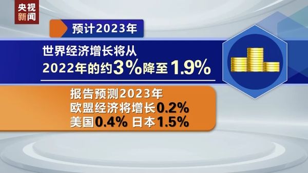 报告还称,在新冠疫情、乌克兰危机、高通货膨胀等影响下,2022年世界经济遭受重创,2023年世界经济继续承压,预计2023年世界经济增长将从2022年的约3%降至1.9%。报告预测2023年欧盟经济将增长0.2%,美国0.4%,日本1.5%。