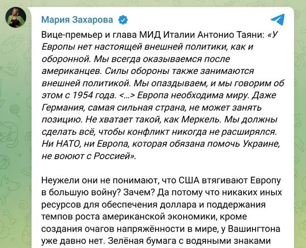 针对塔亚尼称欧盟被华盛顿“主导”的说法,俄罗斯外交部发言人扎哈罗娃25日在Telegram上回应指出,欧洲亟须从其“昏睡”中醒来,因为美国正在“把它拖入一场大战争”。