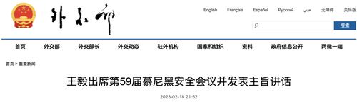 当地时间2023年2月18日,中共中央政治局委员、中央外事工作委员会办公室主任王毅在德国出席慕尼黑安全会议并发表主旨讲话。