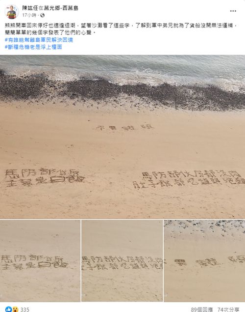 拍下这组照片的是一位名叫陈竑任的岛上居民,他的社交媒体主页介绍自称是马祖地区旅游包车服务公司负责人,并为游客提供拍照服务。这组被标记拍摄于马祖西莒岛的照片显示,沙滩上出现了“不要罐头”、“马防部队主菜是白饭”,以及“伙房都没肉,肚子饿都吃罐头泡面”的字样。