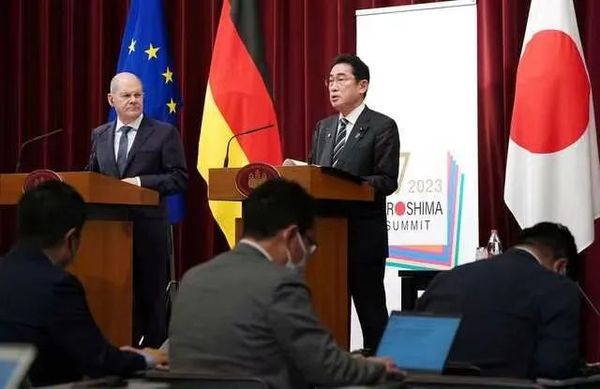 18日晚些时候,朔尔茨(左)和岸田举行联合记者会。