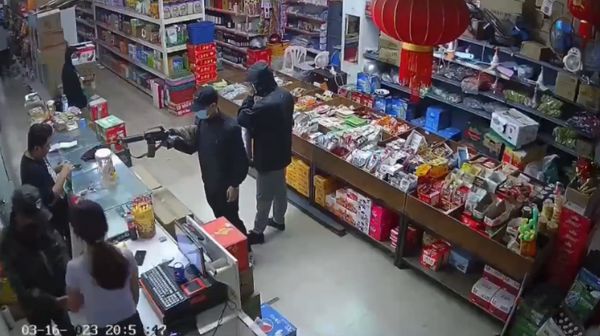 3月16日晚,女店员(左下穿淡紫色上衣长发女子)被绑匪持枪带走。视频截图