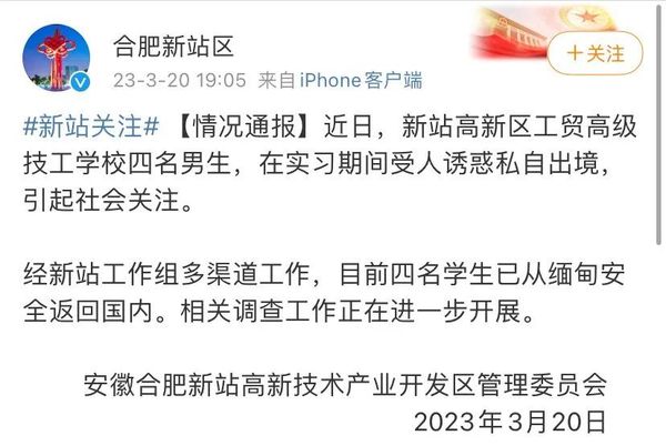 3月20日晚19时,合肥新站区发布相关情况通报称,四名学生实习期间受人诱惑私自出境,现均已从缅甸安全返回国内。