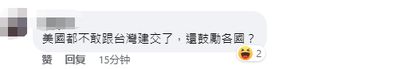 对于美国白宫国安会发言人的“回应”,有岛内网友讽刺:“美国都不敢跟台湾建交,还鼓励各国?”“美国话很多喔。”↓