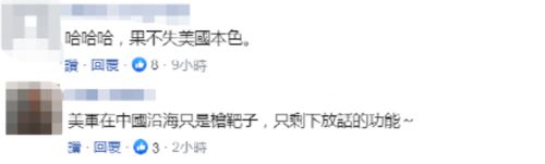 对此,有岛内网友在台媒评论区留言表示,“果不失美国本色”、“美军在中国沿海只是枪靶子,只剩下放话的功能”。
