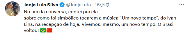 有巴西网友表示,在中方《新时代》的演奏声中,他们切实感受到了巴西在国际舞台上的回归。“感动到哭……有一个受人尊敬的领袖真是太好了。祝我们的祖国一切美好,为了我们的母亲巴西”、“我们的确进入了一个新时代!”