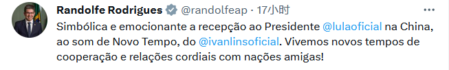 许多代表团成员和巴西政府官员难掩激动,在推特上分享自己的欣喜。参议员伦道夫·罗德里格斯(Randolfe Rodrigues)表示,“在中国受到如此极具象征意义和激动人心的欢迎仪式,我们生活在一个与友好国家合作并建立友谊的‘新时代’!”