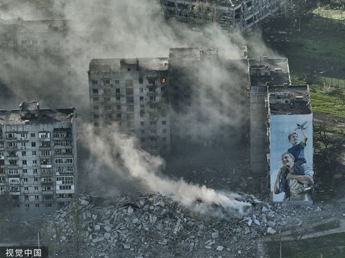 2023年4月26日,顿涅茨克地区,巴赫穆特与俄罗斯军队进行了激烈的战斗,浓烟从建筑中升起。