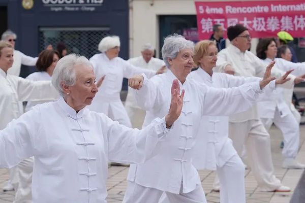 ▲2023年4月29日,在法国圣日耳曼昂莱,太极拳爱好者在第五届太极拳集体演练暨相搏国际邀请赛上表演太极拳。(新华社)