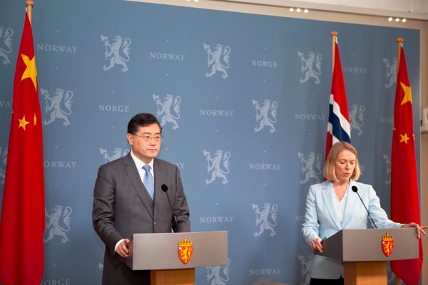 当地时间2023年5月12日,国务委员兼外长秦刚在奥斯陆同挪威外交大臣维特费尔特共同会见记者。……