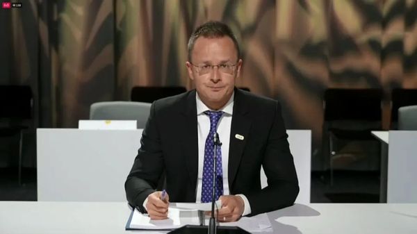 西雅尔多在欧盟外长非正式会议间隙讲话。截图来源:匈牙利M1电视台