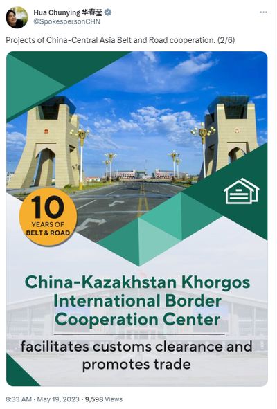 华春莹所发第2张图展示的是中哈霍尔果斯国际边境合作中心,配文称该中心使通关更加便利、促进贸易。↓