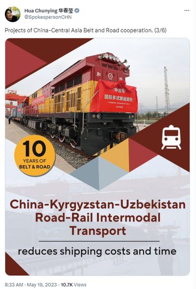 华春莹所发第3张图展示的是“中吉乌”国际多式联运班列,配文称其能够节省运输费用和时间。↓