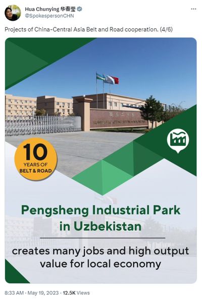 华春莹所发第4张图展示的是位于乌兹别克斯坦的鹏盛工业园,配文称该工业园创造诸多就业岗位、为当地经济创造很高的产值。↓
