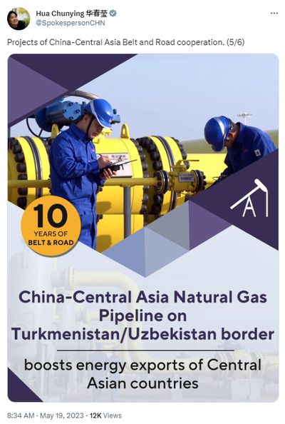 华春莹所发第5张图展示的是起点位于土库曼斯坦和乌兹别克斯坦边境的中国-中亚天然气管道,配文称该管道促进了中亚国家的能源出口。↓