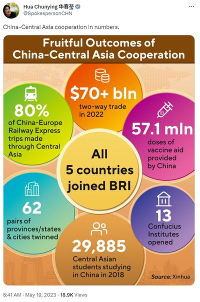 此外,华春莹当天晚些时候还在推特上发了另一张图,援引新华社的多项数据说明中国与中亚合作硕果累累。这张图显示,中亚五国均已加入“一带一路”倡议,80%的中欧班列途经中亚,2022年中国与中亚贸易总额超过700亿美元,中国共向中亚五国提供疫苗援助5710万剂,中亚共有13所孔子学院,2018年中亚来华留学生人数为29885人,等等。↓