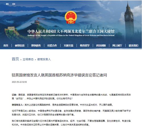 中国驻英国使馆发言人就英国首相苏纳克涉华错误言论答记者问记者:据报道,英国首相苏纳克在东京接受记者采访时声称,……