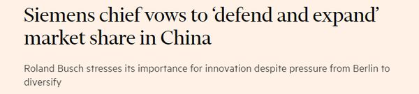 德国政府不断鼓吹减少“对华依赖”,但对德企来说,这一选择并不成立。据英国《金融时报》5月24日报道,西门子公司董事会主席、总裁兼首席执行官博乐仁(Roland Busch)接受该报采访时指出,中国是能把西门子推向下一个创新水准的客户,他誓言将捍卫并进一步扩大西门子在华市场份额。