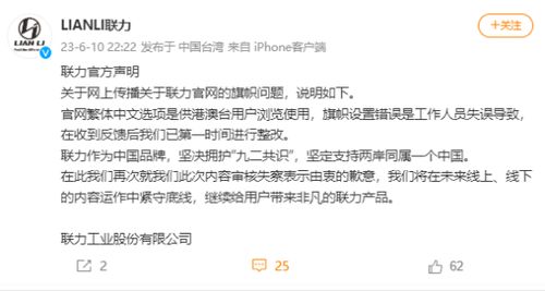 报道称,根据公告所述,联力称繁体中文是提供给港澳台的用户使用,旗帜的设置错误是工作人员的失误所导致,收到反馈后便在第一时间进行修改。联力还称,作为中国品牌,坚决拥护“九二共识”,坚定支持两岸同属一个中国,对此次内容审核失察表示由衷的歉意。