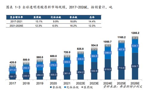 根据研究机构Frost&Sullivan的报告,2021年全球透明质酸原料市场销量达到720吨,其中82%来自中国,而华熙生物一家销量占据全球44%。预计在未来五年,全球透明质酸原料市场将保持12.3%的复合增长率,在2026年达到1285.2吨的市场销量。