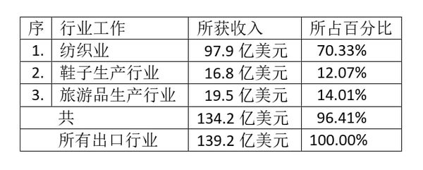 此外去年还出口了鞋子19.5亿美元,出口旅游成品19.5亿美元。纺织品、鞋子及旅游成品生产行业是该国出口行业中最大的三个行业工作,由这三个行业所获得的收入就占总出口的96%以上了。在这些行业工作中的劳工共有913,000人,其中以妇女为大多数,这是由劳工及职业工作部方面获知的数据资料。