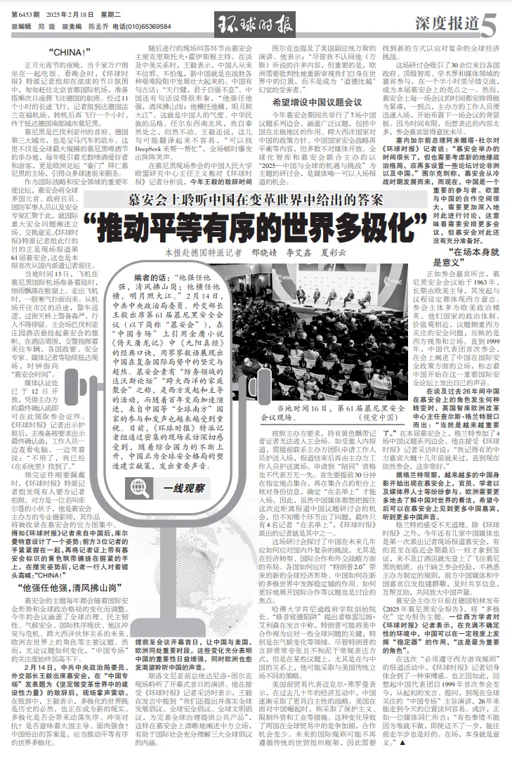 编者的话:“他强任他强,清风拂山岗;他横任他横,明月照大江。”2月14日,中共中央政治局委员、外交部长王毅出席第61届慕尼黑安全会议(以下简称“慕安会”),在“中国专场”上引用金庸小说《倚天屠龙记》中《九阳真经》的经典口诀,用寥寥数语展现出中国在复杂国际局势中的坚定与超然。慕安会素有“防务领域的达沃斯论坛”“跨大西洋的家庭聚会”之称,是西方发起和主导的活动,而随着百年变局加速演进,来自中国等“全球南方”国家的参与和发声也越来越受到重视。日前,《环球时报》特派记者组通过密集的现场采访深切感受到,随着综合国力的不断上升,中国正为全球安全格局的塑造建言献策,发出重要声音。