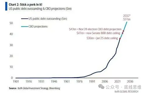 关税战期间,特朗普还推动美国国会通过《大而美法案》大搞减税,代价是美债上限提高了5万亿美元,美债指数上涨的速度又提升了。据美国国会预算办公室 (CBO)估计,2028年11月新的大选举办时,国债总额将达到43万亿;2032年再一次大选时,达到51万亿美元。