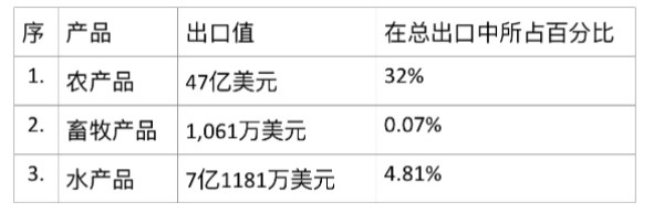 而对外出口方面农牧水产品出口值及在总出口值中所占的比例如下: