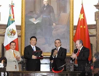 2013年6月5日,习近平在墨西哥城接受该市市长曼塞拉授予的城市钥匙。授予仪式在市政府大楼举行。习近平从曼塞拉手中接过墨西哥城城市钥匙、勋章和荣誉市民证书。