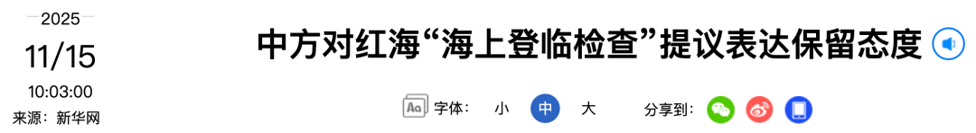 中方对红海“海上登临检查”提议表达保留态度制作:环视频/王力中国常驻联合国副代表耿爽14日在联合国安理会表决涉也门制裁机制授权延期决议草案后作解释性发言,对有关国家试图推动红海和附近水域“海上登临检查”表达保留态度……