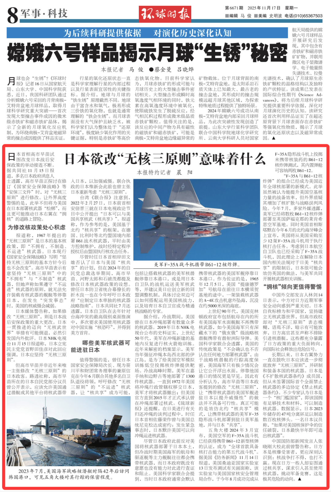 但高市早苗并非近年来唯一主张修改“无核三原则”的日本政客。路透社称,高市早苗所在的日本自民党部分议员曾公开表示,应该允许美国通过潜艇或其他平台将核武器带入日本,以加强威慑。联合执政的日本维新会此前也曾主张日本重新考虑“无核三原则”。