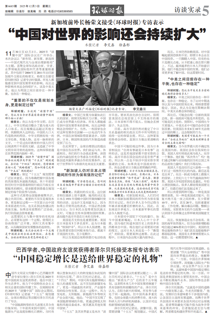 11月30日至12月2日,2025年“读懂中国”国际会议在广州举办。本次会议以“新布局、新发展、新选择——中国式现代化与全球治理新格局”为主题,荟聚全球知名政治家、学者、业界领袖及国际组织代表等重量级嘉宾,其中包括于2004年至2011年出任新加坡外交部长的杨荣文。杨荣文在接受《环球时报》记者专访时强调,所有人都能感受到中国发展带来的影响,而且这种影响未来还会持续扩大。谈及中美关系,他认为两国之间目前存在一种平衡,也存在一种稳定。