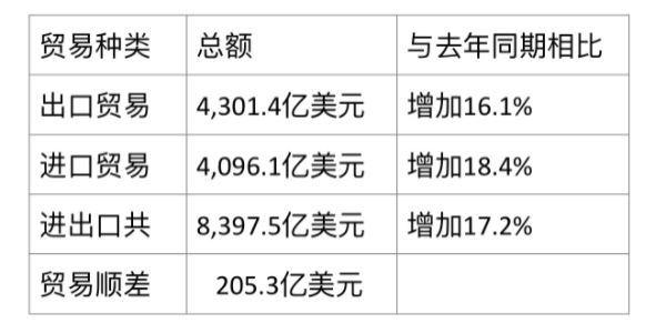 这当中出口为4301.4亿美元,与去年同期相比增加16.1%。出口为4096.1亿美元,与去年同期相比增加18.4%。