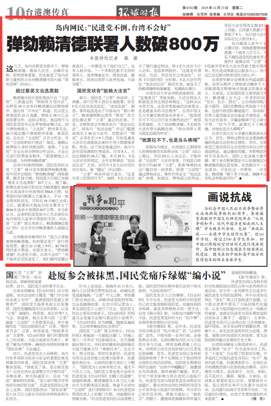 岛内媒体人彭华干22日撰文称,网络联署弹劾赖清德一下就有几百万人,可见不满民进党的民意有多么强烈!就算必须“立委”2/3同意并须9名大法官同意才能实现弹劾,但光是成案就足以振奋人心,因为这已经足够反映相当民众的心声。