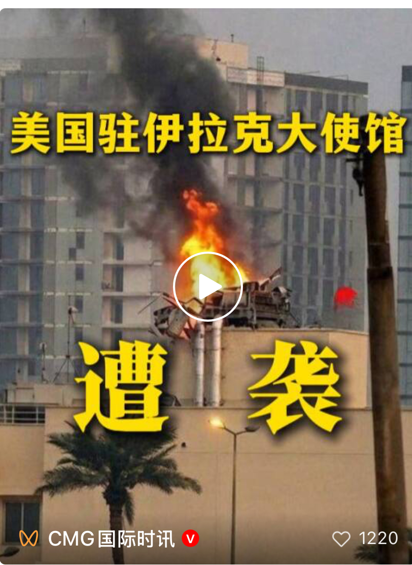 据美国方面14日消息,美国驻伊拉克大使馆的直升机停机坪遭一枚导弹袭击。另据披露,伊拉克安全人士称美国在伊拉克首都巴格达的使馆当天遭无人机袭击。