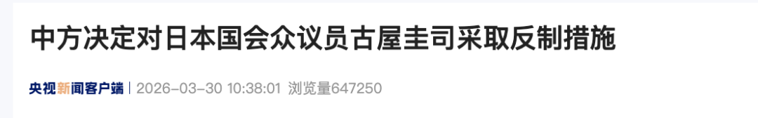 中方决定对日本国会众议员古屋圭司采取反制措施