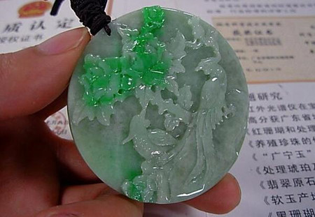看:底色越清透越好,最常见的是绿色,纯净鲜艳者最好。杂质少,且质地细密。业内所说的“A货”是指没经过注色等加工,品质天然的。B货在光照下会比A货浑浊,缺乏清澈感。两种品质价格差别在十倍左右。