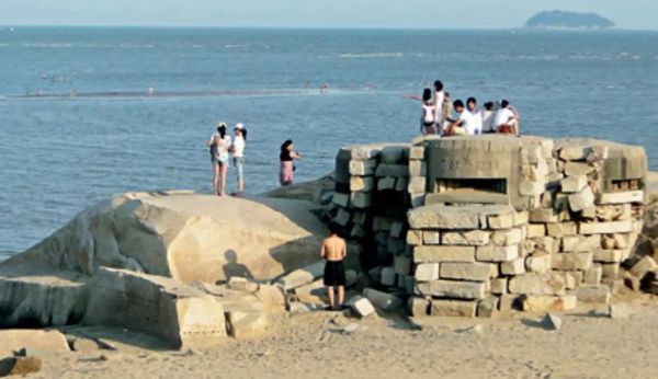 (图为坐在碉堡上远眺金门。作为海防前线,厦门至今留存着众多的明碉暗堡)
