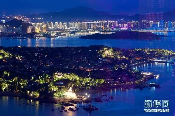 (图为鼓浪屿与厦门岛的灯火在夜色中交相辉映)