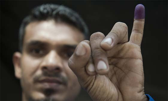 2015年11月8日,缅甸民众参加大选投票后展示手指上的墨迹