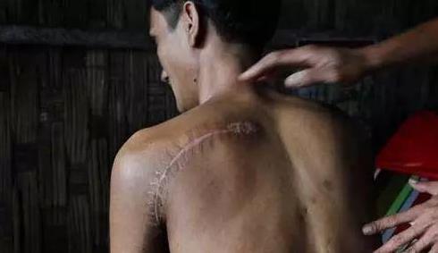 缅甸若开邦 一名男子展示他背上的伤疤 他在之前爆发的骚乱和纵火事件中受伤