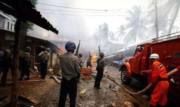 2012年 缅甸消防员在若开邦实兑的一处骚乱街区准备灭火