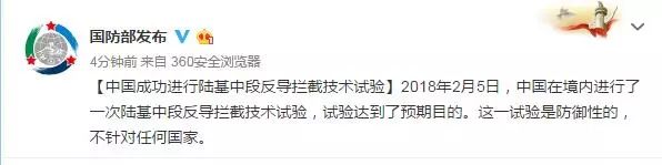 按照此前发布过的消息显示,这是中国第四次成功进行此类试验。与此同时,国防部官方微博称,“这一试验是防御性的,不针对任何国家”。在岛叔看来,官方说的也的确是大实话,中国的历次实验的主要目的还是在于发展自身国防建设。