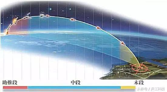 弹道导弹的飞行一般分为三个阶段:当导弹从发射架发射到飞出大气层之前,这一阶段叫做上升段;之后,导弹飞行飞出大气层,在大气层外飞向目标,这一阶段是飞行中段:重返大气层后,导弹到达目标区域上方继而命中目标,这一阶段被称为重返大气层阶段,或者叫末段。