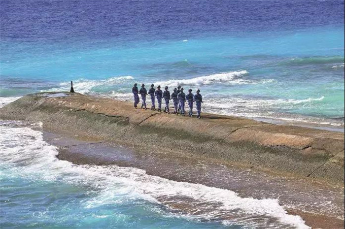 守卫在南沙群岛永暑礁上的海军官兵在防波堤上巡逻。图/新华