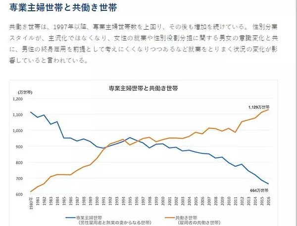 下图为夫妇都工作的家庭和全职主妇家庭的走势,