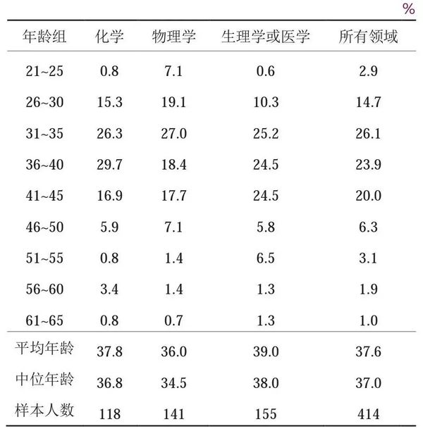 下图为《知识分子》杂志上的对诺贝尔奖取得成果年龄的统计,时间为1901-1992年,可以看出26-45岁是黄金年龄。我国诺贝尔奖得主屠呦呦做出成果的时间就是41岁左右