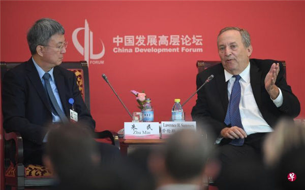 哈佛大学教授、前校长、美国前财政部长劳伦斯·萨默斯(右)昨天在中国发展高层论坛经济峰会的“新时代的中美关系”分论坛上说,中国应正视和回应美国民众的反自由贸易情绪。(中新社)