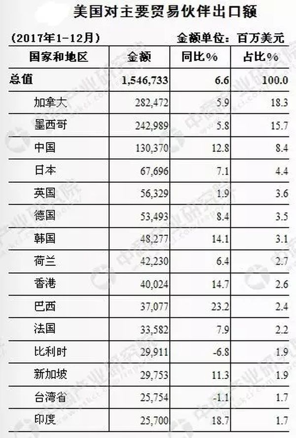 2017年,中国是美国的第三大出口国。一千三百多亿美金的商品出口到中国,占全国总出口的8.4%。没了中国的市场,美国承受的起吗?美国经济承受的起吗?美国人民承受的起吗?