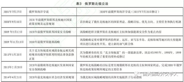 2001年以来,俄罗斯政府通过颁布一系列多领域、多层次、多视角的政策文件作为其实施北极开发的法律依据,规定了实施北极战略的指导方针、各级政府职能、部门协调机制、任务具体实施等诸多细节,形成较为完整的北极战略(见表3)。同时,文件还明确规定了政府部门、国防部、国家安全部门的职责和任务,北极安全战略也随之形成。